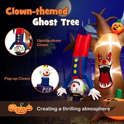 - Spooky Dead Tree with Clown: The inflatable dead tree is designed in clown theme. Not only does the tree wear a clown makeup, but it is also paired with 2 clowns and 2 pumpkins—one is downward hanging over a branch, the other is popping up from a box. All above create a spooky Halloween atmosphere.