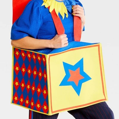 Take on Halloween celebrations in fun style in this Adult and Kids’ Jack-in-the-Box Halloween Costume from Hyde & EEK! Boutique™. This Halloween costume features a colorful box, a blue short-sleeve tee and a blue, red and yellow clown hat for a fun look. Crafted from a lightweight fabric for comfy wear and featuring a pullover design, this costume makes a fun pick for trick-or-treating or pretend play for kids, while letting you transform into a humanoid jack-in-the-box as you hand out treats on Halloween.