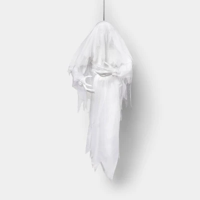 Add a spooky yet fun touch to your Halloween decorations with this Animated Lady Ghoul Halloween Decorative Mannequin from Hyde & EEK! Boutique™. This hanging Halloween decoration features a lady ghoul mannequin wrapped in a white cloth with claw-like hands for a flowy, spooky-cool finish. The eyes light up with the help of the included AAA batteries. Designed for indoor or sheltered outdoor use, you can hang this decorative prop alone or with other Halloween props for a eerie display.