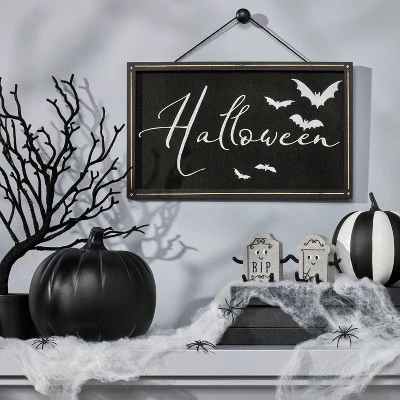 Decorate your home for Halloween in spooky style with the Bats Halloween Wall Sign from Hyde & EEK! Boutique™. This black wall sign features the message “Halloween” along with a bats illustration in white for a decorative look that’s perfect for your seasonal decor. Crafted from wood, this framed wall sign comes with a built-in loop for easy hanging indoors or in a sheltered outdoor area.