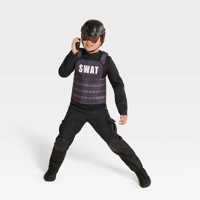 Your kid will look and feel like their hero on Halloween night in this SWAT Officer Halloween Costume Jumpsuit with Accessories from Hyde & EEK! Boutique™. Crafted from lightweight material, the costume set includes a walkie talkie, SWAT vest, jumpsuit and helmet. The side patch pockets add functional detail to their look, while the back hook-and-loop closure offers ease of wear. Pair with black shoes to complete the look.