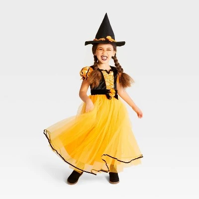 Your kiddo will look as cute as ever dressed up in the Witch Halloween Costume Dress with Hat from Hyde & EEK! Boutique™. This witch costume dress comes in a yellow color with black stripes along the puff sleeves and neckline, and a matching black hat with yellow floral detailing for a coordinated look. The mesh lace below the waist creates an amazing look, while the black hem adds to the contrast. Made with soft and lightweight fabric, this two-piece costume dress offers comfort — have them pair it with black ballet flats to complete the look.