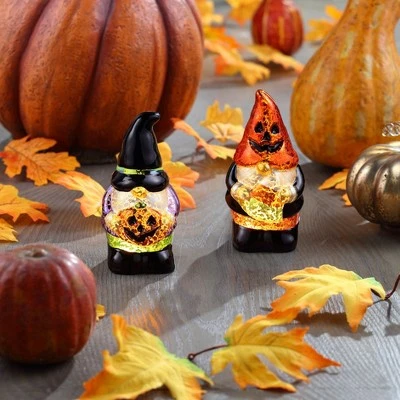 Light up your home this Halloween with this delightful Set of 2 Mercury Glass Gnomes by Mr. Halloween. These 6″ gnomes are battery-operated and lit from within for a 360-degree shimmering glow. These adorable gnomes are dressed in festive Halloween orange and green and hold an illuminated jack-o-lantern and candy corn. With LED illumination, these gnomes spirit comes to life and make a sweet decoration perfect for any Halloween loving home, haunted or not.