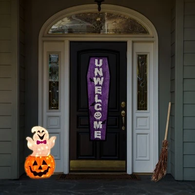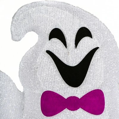 This Halloween decoration features a happy face jack-o-lantern with a wide-smiling and bowtie clad ghost rising from inside. It is constructed of a glittering tinseled fabric that is wrapped around a sturdy wire frame and lit from inside with 40 battery operated warm white LED lights. This fun and unique decoration can be displayed in indoor or covered outdoor locations.