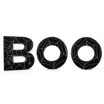 This frightening and fun Halloween decoration is constructed of tinseled black fabric over a sturdy wire frame featuring a spider web motif. The inside and outside perimeters of each letter is lined with a neon style light strip containing hundreds of LED lights that produce an eerie orange glow. Each individual letter includes a ground stake for sturdy outdoor display.