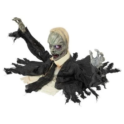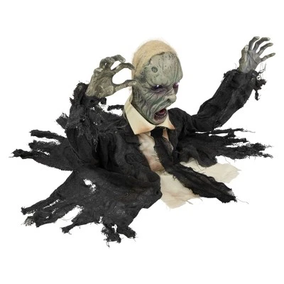 Look out, there’s a zombie crawling out of the ground. Sure to scare your trick-or-treaters and visitors away. You can pose this guy near a tombstone to make it seem like he’s crawling out! His eyes light up with white LEDs, while his head turns from side to side, and creepy music plays while he makes eerie screaming sounds. He is both touch and sound-activated and perfect for a graveyard scene or a haunted house. Who will dare approach him? Product features:Animated zombie is decaying with matted blonde hairWears a torn jacket, dress shirt, and black tieHis head turns from side to side while his eyes light up and flash on and offCreepy Halloween music plays while he makes screaming soundsBendable arms allow you to position them as you chooseTouch and sound activated when turned onConvenient on/off switchRequires (3) ‘AA’ size batteries – includedFor indoor or covered outdoor useDimensions: 19″H x 29″W x 16″DMaterial(s): plastic/foam/polyester