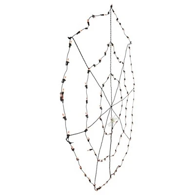 This lighted spider web will provide two decorations in one. Just perfect for your Halloween decor, a lighted spider is designed on on black wire, resembling a spider web. Decorate a mantelpiece, window or entryway with this fun web decoration.Product Features:Multi-dimensional lighted spider webColor: orange bulbs / black wire Number of bulbs: 100Bulb size: miniBulb type: incandescent36” black lead cordSuction cups included for window displayAdditional Product Features:For indoor use onlyComes with replacement bulbs and spare fusesContains 1 plug with end connector which allows you to stack multiple garlands together (not to exceed 210 watts)Wire gauge: 220 volts, 0 hertz, .00 amps, 0.0 watts Web dimensions: 5′ high x 55″ wideMaterial(s): PVC/glass bulbs/wire/metal