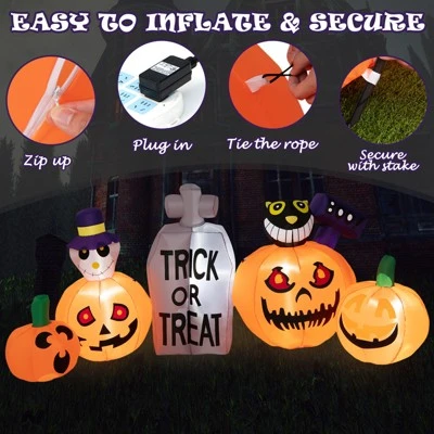 - 8FT Long Pumpkins with Tombstone: Composed of pumpkins and tombstone reaching 8ft long, the inflatable decoration greatly attracts and impresses people. Moreover, 2 pumpkins with green stems and the other 2 with black cat and ghost respectively, making the Halloween decoration more colorful and fit for Halloween