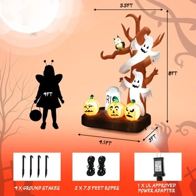 - Fancy Dead Tree Appearance: Our glowing inflatable is a dead tree with 2 white ghosts and a cute owl, and at the base of the tree, three pumpkin heads placed side by side next to the tombstone. The unique look makes kids fall in love at first sight. Plant an 8ft inflatable dead tree in your yard and the Halloween vibe spreads.